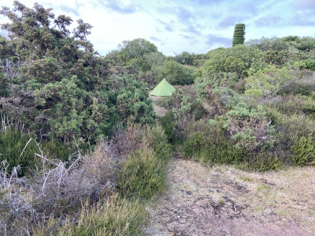 I nervously approached my first wild camp on the trail, again beset by doubts. Would I find a suitable spot to pitch my tent? Would there be people there? Would I be discovered and moved on by an irate landowner? Fortunately, there were plenty of grassy areas in between the tumble-down stone ruins. I pitch my tent facing an old chimney poking gauntly out of the brambles, scrabbling for large stones to put over my pegs to stop them from being ripped out of the sandy soil by the fresh breeze.